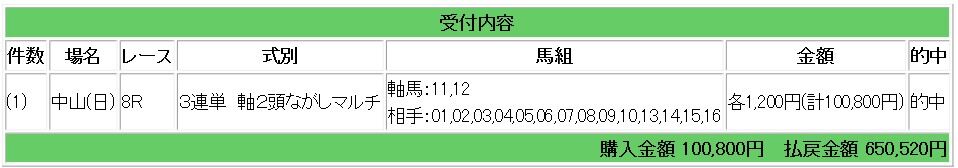 上記情報馬が1,3着となり、3連単542.1倍的中で65万520円の払い戻しとなりました。
