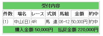 上記情報馬野ワンツー決着となり、馬連4.4倍的中で22万円の払い戻しとなりました。