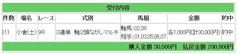 会員様には馬連・3連単指示となり、馬連20.1倍的中で30万1500円の払い戻しとなりました。