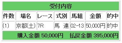 上記2頭のワンツー決着となり、馬連10.1倍的中で50万5000円の払い戻しとなりました。