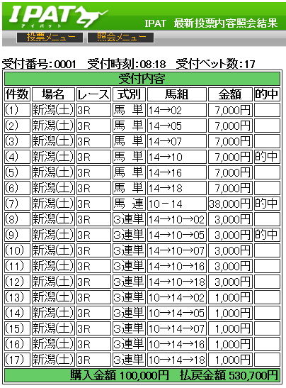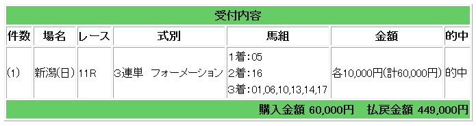 先週は管理人の大勝負レースで約55万円を獲得していただきましたが、今週の管理人の大勝負レースは土曜日の新潟3レースで大きく儲けていただきました。