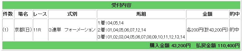 会員様には上記3頭の1着固定の3連単指示で究極の伏兵馬5ミッキースワローが3着となり、552倍的中となり、11万400円獲得となりました。