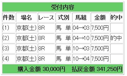秋の天皇賞は3連単4点指示となり、20.4倍的中で30万6000円の払い戻しとなりました。